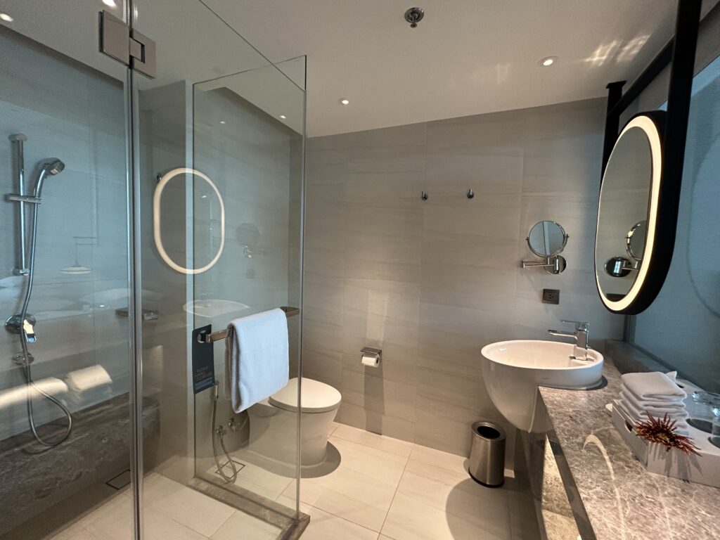 バスタブありませんが、シャワーも使いやすく、いつもコートヤードらしい、座って洗えるコーナーもありました。