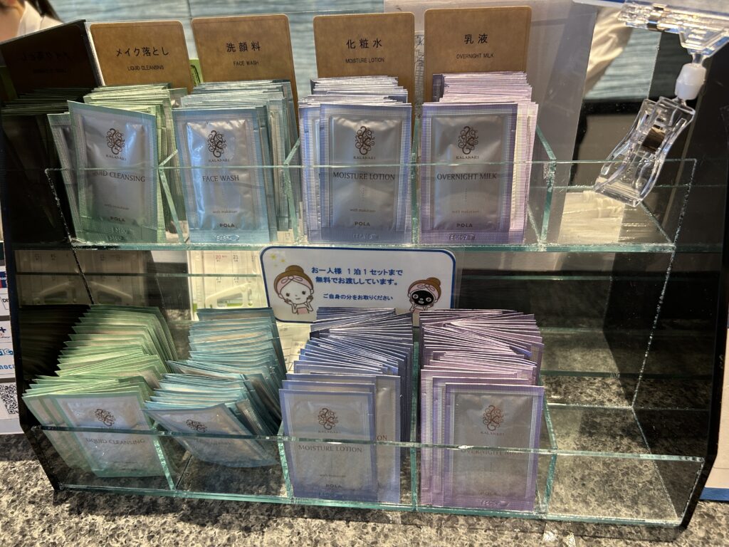 ロビー付近に基礎化粧品などの用意がありますので必要な分をいただけるようになっていました。