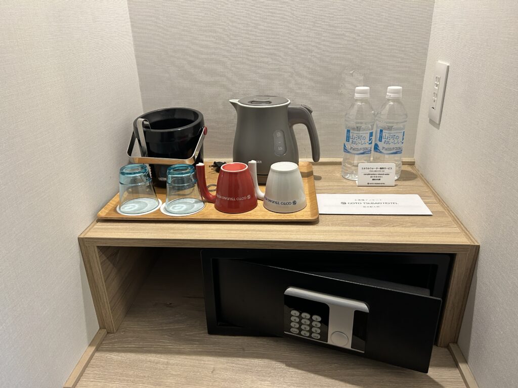 水は1日2本。セキュリティーボックス完備。この下にミニ冷蔵庫があります。