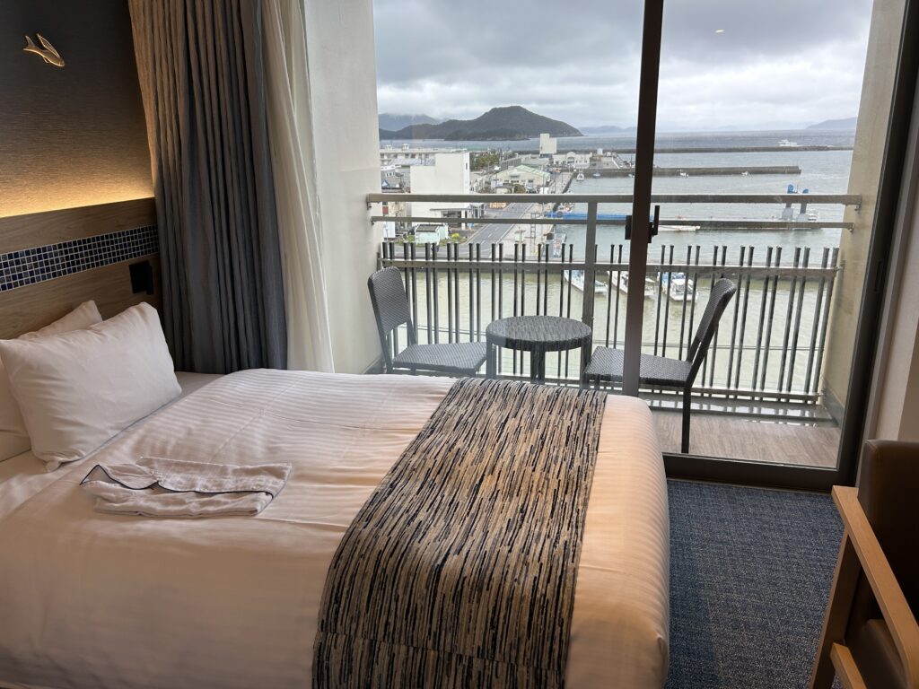 部屋に入った瞬間、まず目に飛び込んでくるのは窓の外に広がる福江港の景色と穏やかな港に浮かぶ船々と島々!